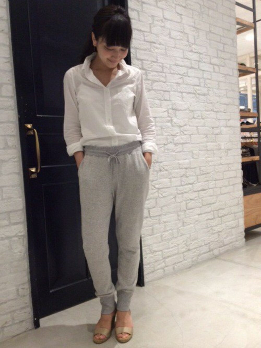 今の気分のスウェットパンツ。 シャツとエスパドリーユで女性らしく!