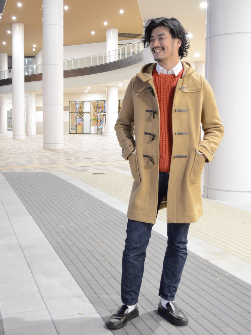 暖かい色合わせで冬を満喫ファッション。 白シャツの襟元がアクセントに、 またカシミヤ混ダッフルの柔らかな質感が全体の雰囲気をまとめあげます。