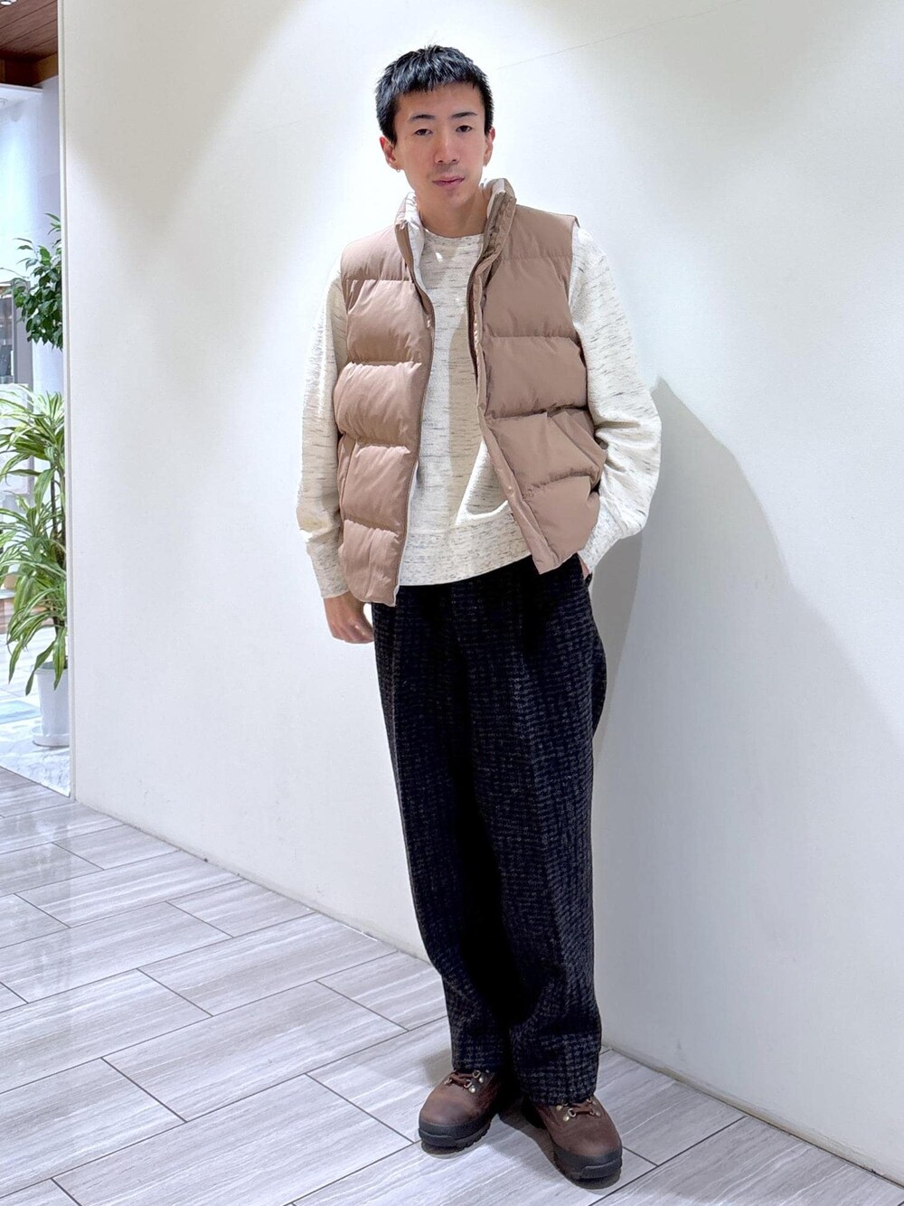 こんにちは! 今回はダウンベストを使ったコーディネート紹介です。 今年の冬のアウターは皆様何を選ばれましたか? コートは着脱したときに荷物になっちゃうし、ダウンブルゾンは屋内入ると暑すぎちゃうし、、、 そんな悩みを持たれてる方にこそ!ダウンベストという選択肢を! アーム、身幅を広くとっているので、厚手のニットやスウェットでもストレスなく上から着用できます!