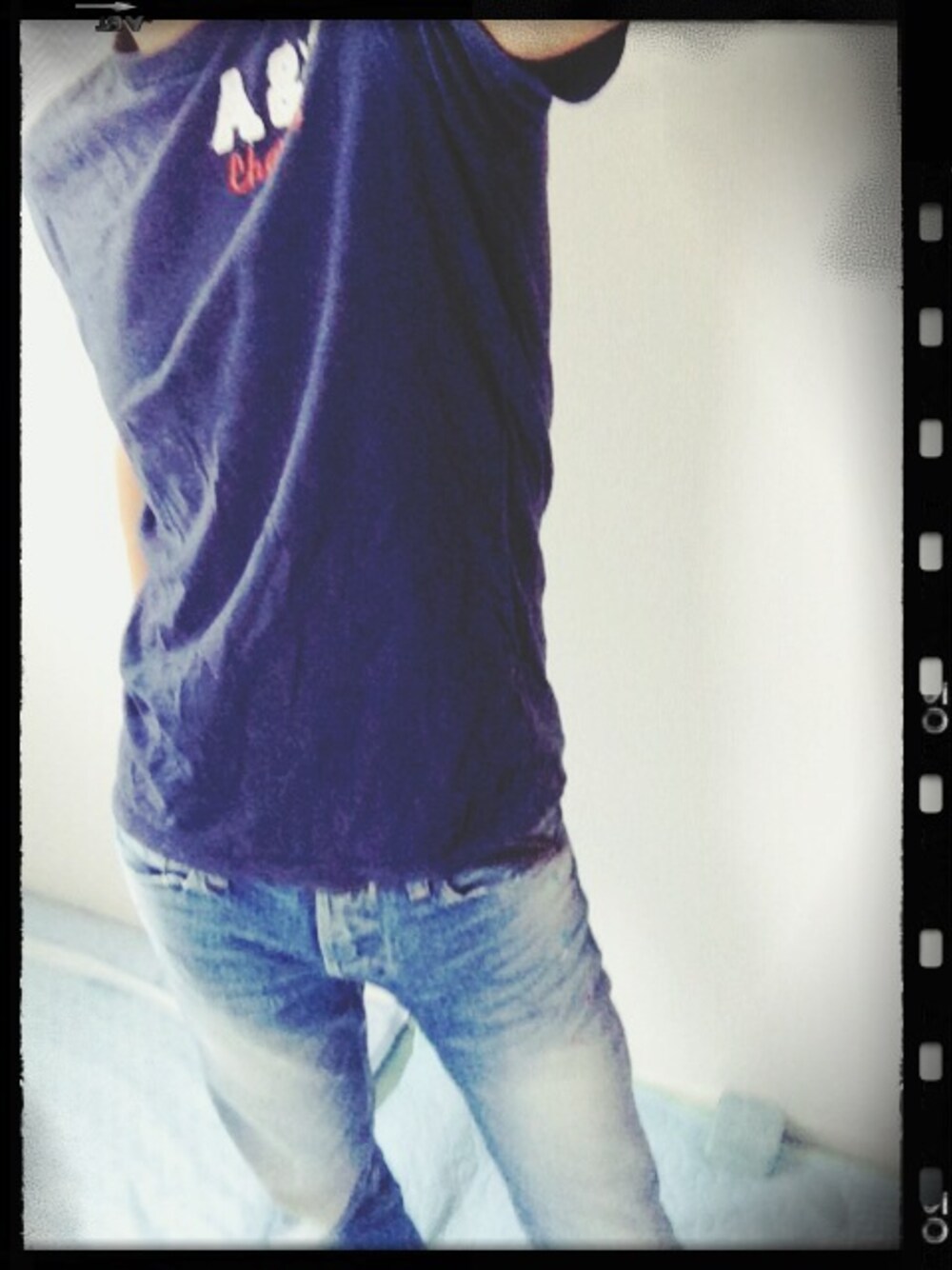 アバクロの青いTシャツとジーンズ。