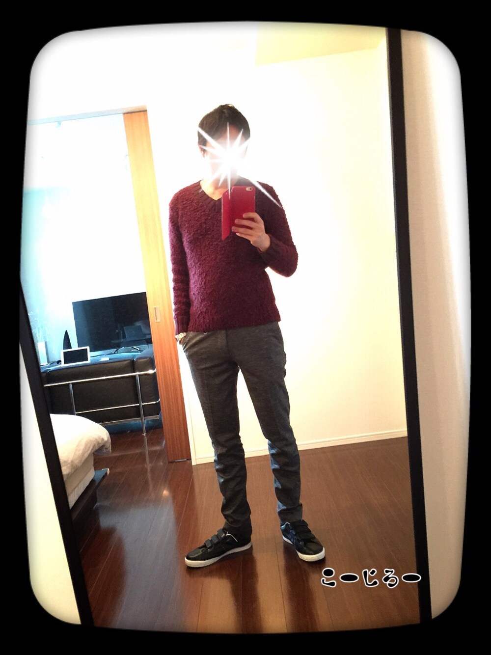 ボルドーのニットとスラックス! 少し寒い時はマフラーで!