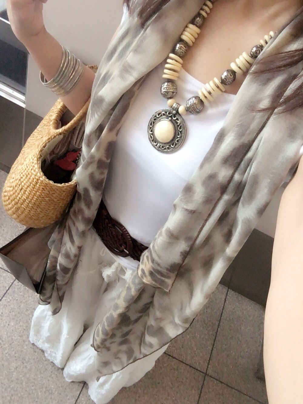 最近は ホワイトコーデにはまってますけど 体型があまり良くないのでストールなどで誤魔化してます(^^;; 大判のストールは 涼しい時には 肩から羽織ったりできるので便利です。 なかなか うまくコメントできませんけど いつも いいね をくださる皆様には感謝してます。 熱中症などにはお気をつけくださいね(o^^o)