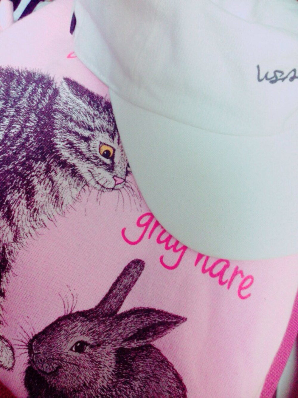 ピンク系のTシャツ/カットソー、ホワイト系のキャップを着用したレディースの冬コーディネートの1枚目の写真