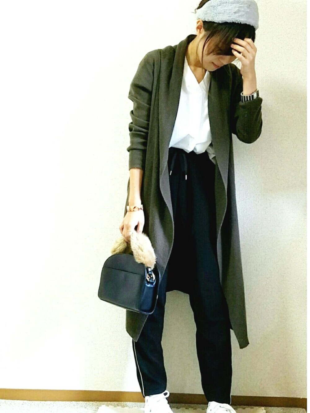カーキ×ブラック×ホワイトの カジュアルコーデ👖👚 メンズライクに✨ 服がシンプルだったので、 guのターバンをon❗