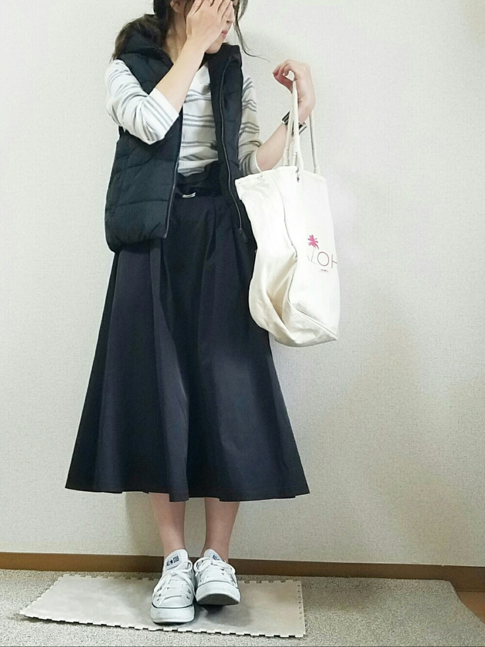 モノトーンコーデ👖👚 guのダウンベスト、温かくて軽い❗ 早く買いに行けば良かった😰😰 カジュアルになりすぎないよう、ミモレ丈きれいめスカートに合わせました🎵