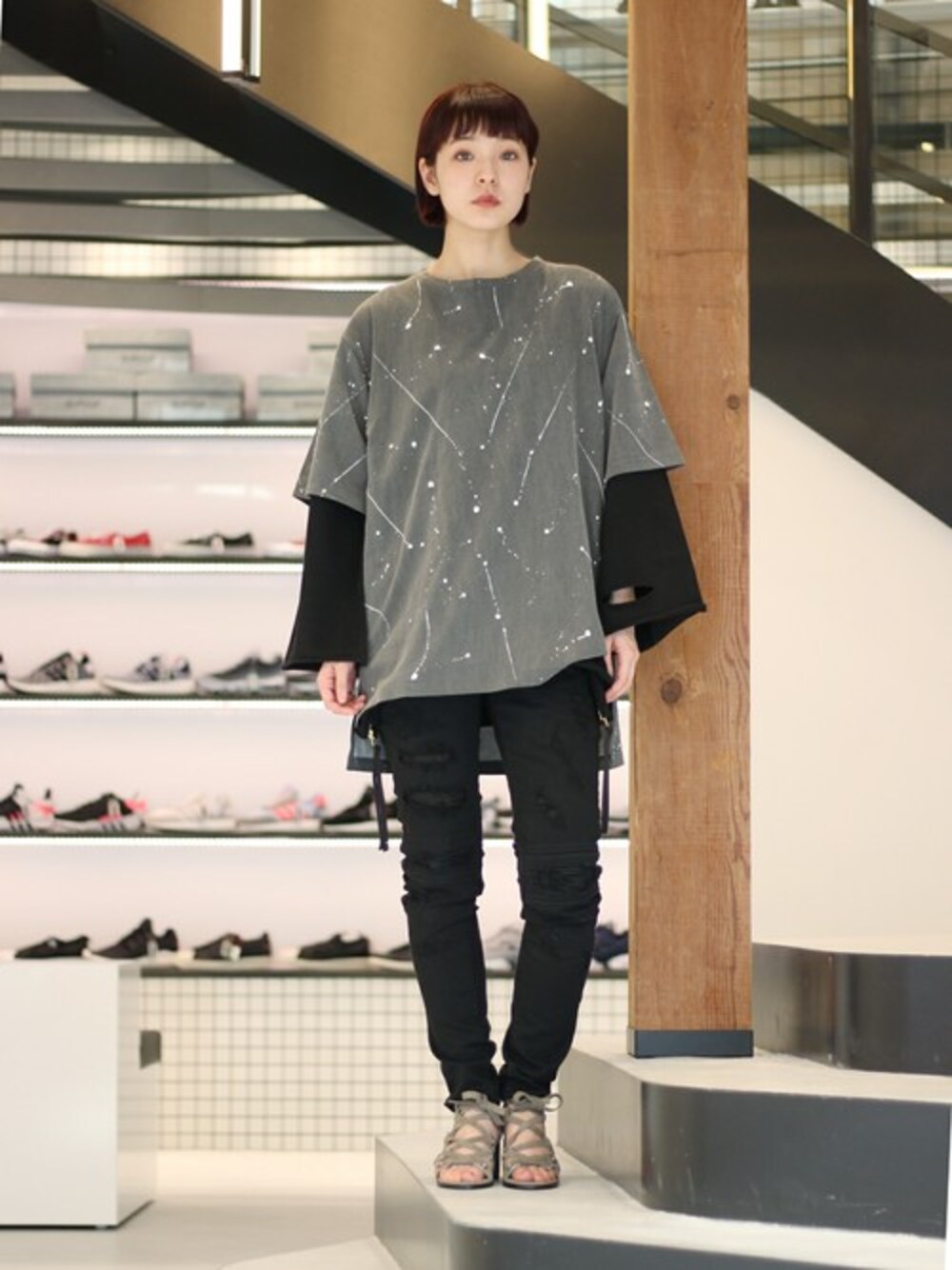 PULPらしく、ジェンダーレスにメンズアイテムでコーディネートしてみました。ビッグサイズのカットソーをレイヤードし、スキニーパンツをチョイス。足元はドレッシーなサンダルでメリハリを効かせています。