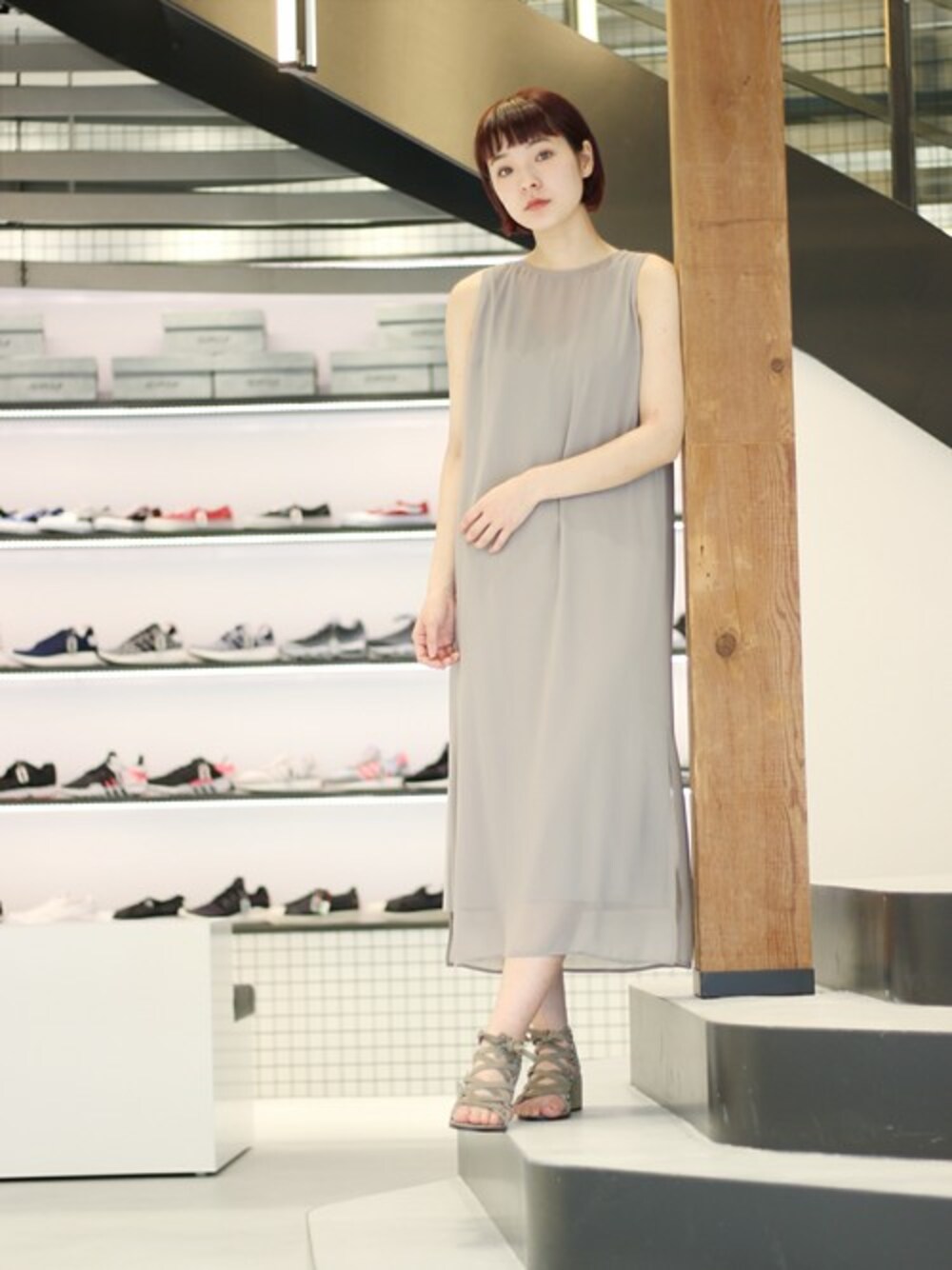 大人顔のマキシ丈ワンピースで、夏のスタイリングを爽やかに演出。薄手の生地が作りだす軽やかなドレープが魅力的です。ワントーンでシックにコーディネートしました。