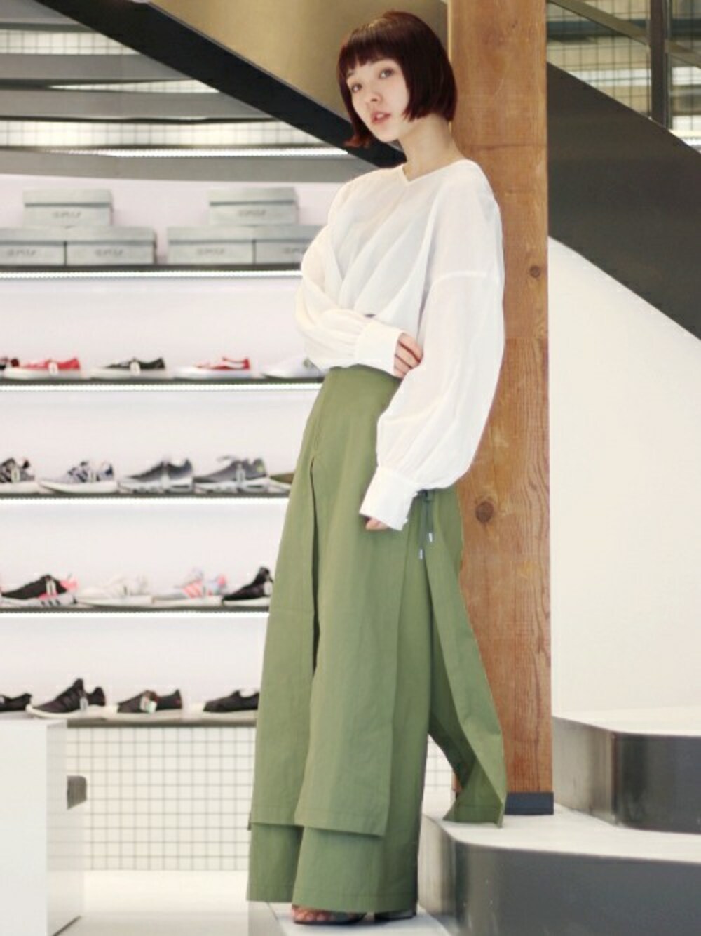 今年らしいビックシルエットのプルオーバーをメインにコーディネートしました。涼しげな薄手のコットン素材は着心地が良く、ナチュラルな雰囲気が魅力のアイテム。前身頃に入ったギャザーとVネックライン、ボリュームスリーブも女性らしさを強調する嬉しいポイントです。