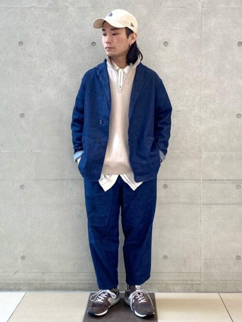 【ライトダンボールスタンドジッププルオーバー】 オーバーサイズ過ぎないリラックスシルエットで一枚着出来てもこなれ感を演出できます。 今回はインナーとして使用し、デニムの野暮ったさをスポーツミックスすることによりクリーンな印象に仕上げてます。