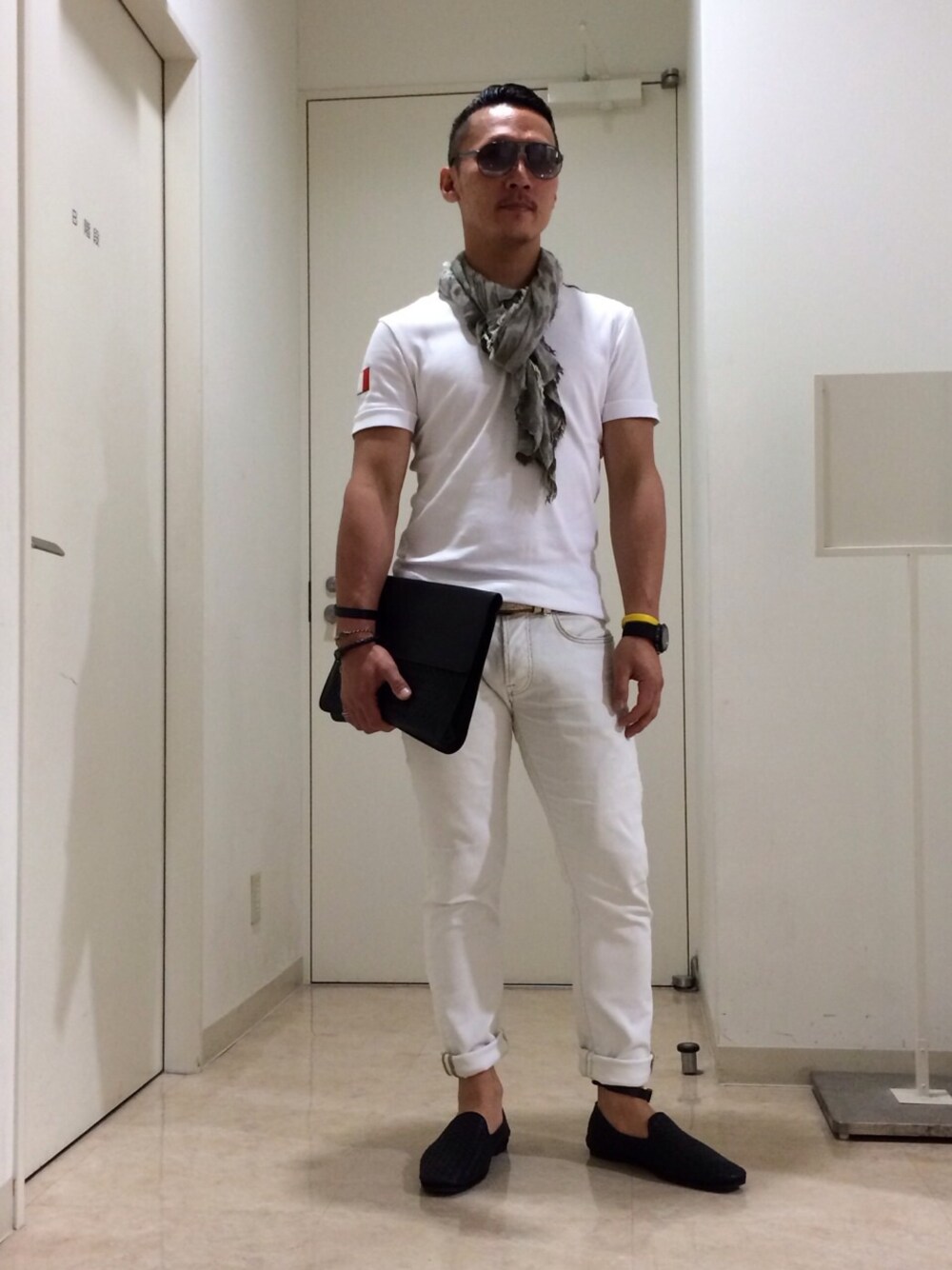 トップス... GAS デニム... GAS ストール... GAS サングラス... カレラ シューズ... ボッテガヴェネタ クラッチバッグ... ボッテガヴェネタ アクセサリー他... ボッテガヴェネタ ホワイトコーデ(笑) 爽やかな感じの中にもワイルド有り(笑)
