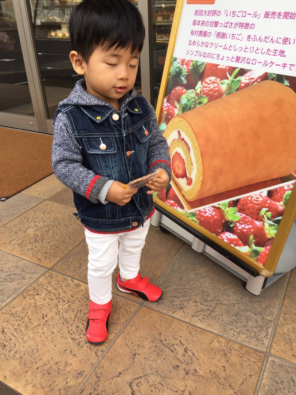 1歳半検診💞💞 足元はお揃いで👫 大きい息子は、一人だけかなりBig( ´థ౪థ) 周りの子と頭一個分は違ってびっくり💧 帰りにケーキ買って帰宅♬
