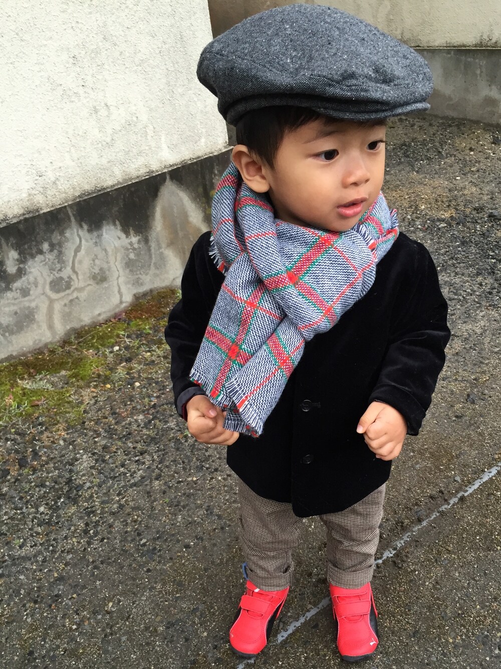 気づいたら全身H&M baby🙌💕💕 お天気悪いから、近くの自販機まで一緒におつかい♬ 帰り道☂降ってきて、息子抱えてダッシュ(笑) 一緒に大笑いして、平和だなぁ〜ってほっこり😆✨✨ ストールとハンチングは、ZARAbaby🎩