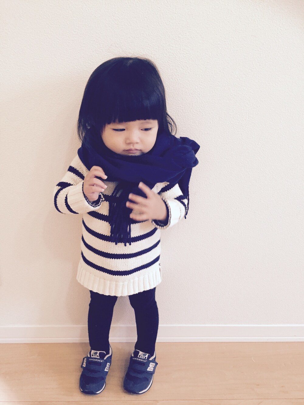 ネイビー×ボーダー ワンピースのおしりにはタイツのくまさんがチラチラ♡ この時期だけの特権 タイツのおしりチラチラ満喫中♡