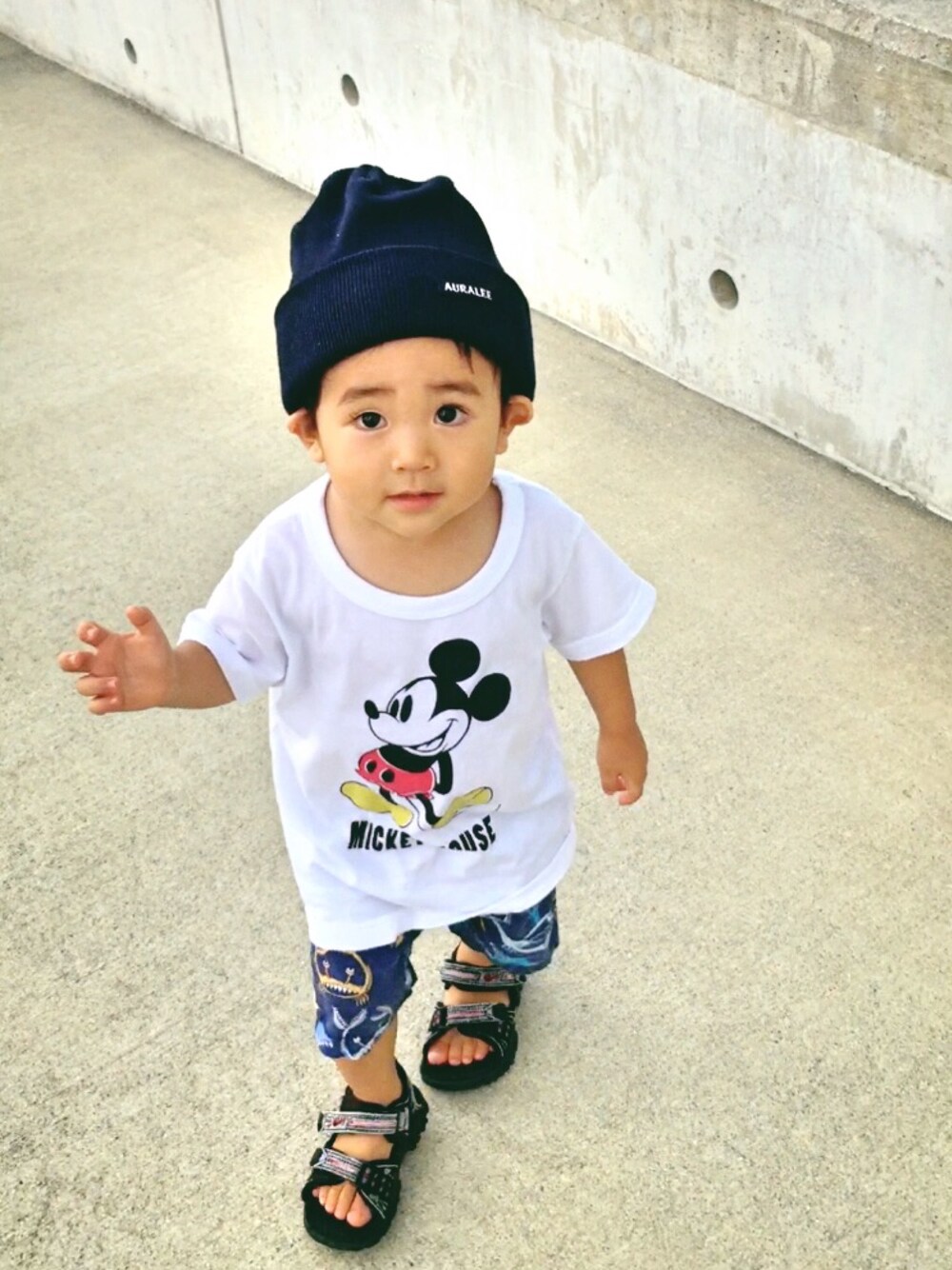 ブルー系のニットキャップ/ビーニーを着用したキッズの夏コーディネートの1枚目の写真