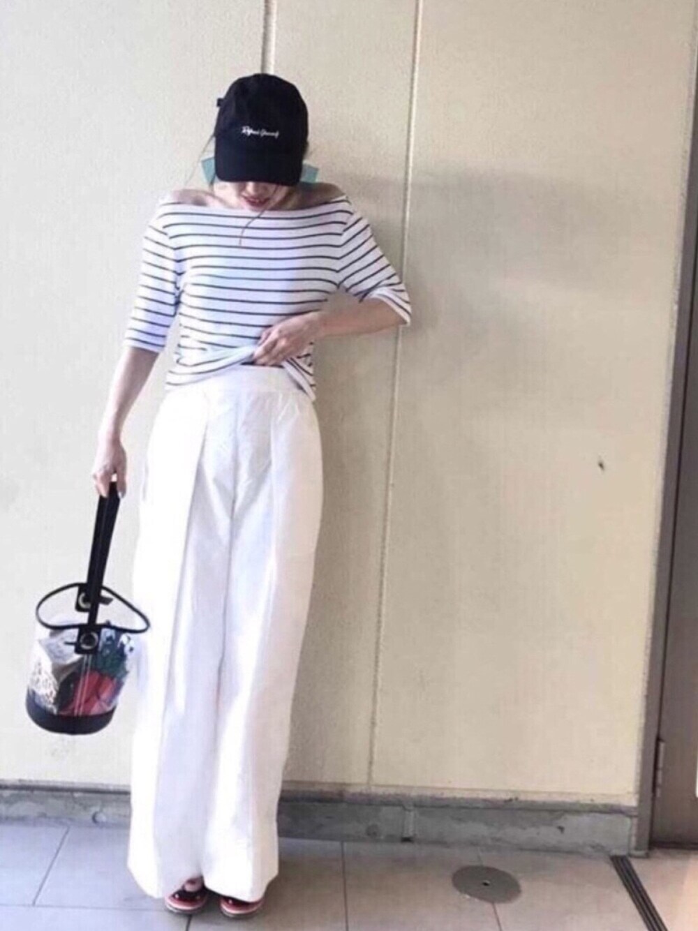 たまにはシンプルモノトーンコーデ Tシャツを前だけインしようとしてる瞬間😅 ボーダーTはほんとはボートネックですが、肩を落としてオフショルで着てみました! 白の分量多めで、小物は黒で締めました サッシュベルトしようか迷ってやめちゃった😅 ご覧いただきありがとうございます😊🙏
