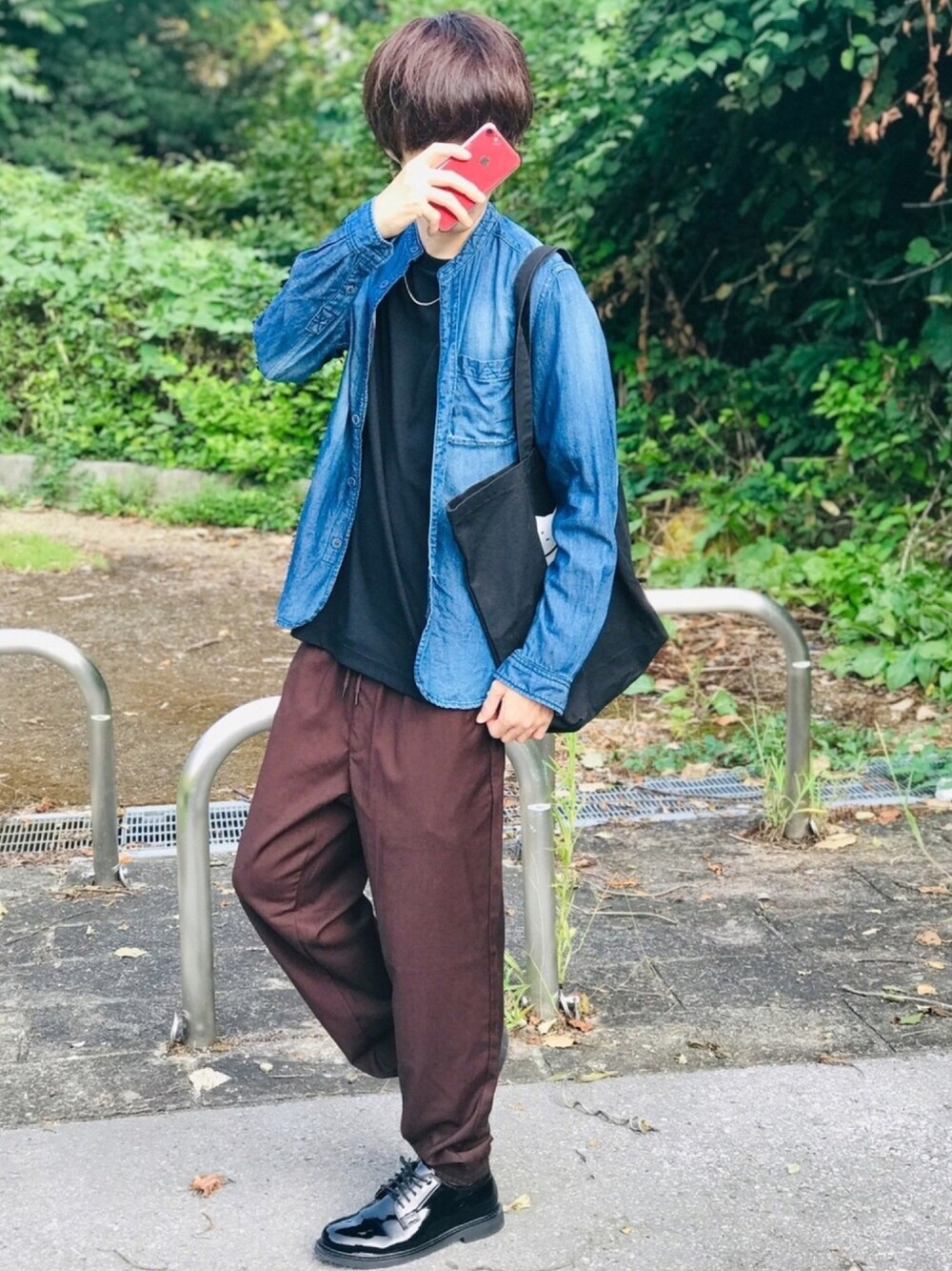 デニムバンドカラーシャツを使って秋コーデ🍂 前回のコーデと似ていますが今回はデニムバンドカラーシャツ着ました✨ インナーもブラックに変えました🤩 少し変わるだけで印象も変わりますね☺️ ブラウンとテカテカの革靴相性良き⭕️