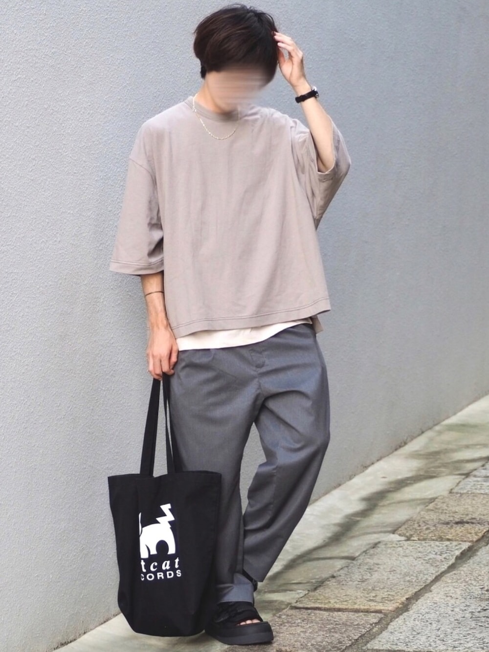 夏のグレーコーデ🦈☀️ ものまねコーデ第30弾💣(色味だけ) ビッグT×ワイドスラックス ネコ🐈トートで抜け感出しつつ大人っぽく雰囲気のあるコーデに☝️👨⚕️ jiedaのビッグTの色味が最高でした🌟