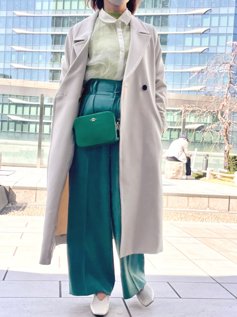 少し派手めなラメトップスをシアーシャツで合わせて派手になり過ぎないように⭐️ グリーンのボトムはなんとも言えない光沢感があり、お気に入りのスプリングコートともバッチリ✨ 春夏に大活躍しそうです♪ とっても大人可愛いスタイルに仕上がりました(*^^*)