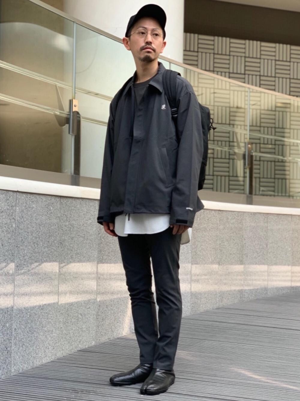 全体のカラーをモノトーンにしました。帽子、バッグやシューズをブラックで統一し、スタイリングにメリハリをだしています。 【size ブルゾン L Tシャツ L タンクトップ XL パンツ S 】