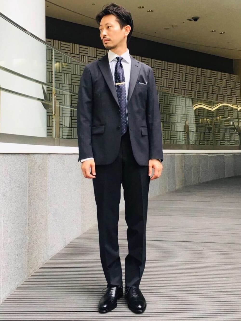 【身長171cm size ジャケット 44 シャツ 37 パンツ 76 シューズ 40 】 グレースーツにネイビーのドット柄のネクタイとチーフを合わせました。シャツを薄いブルーにして、全体のトーンを中和させています。