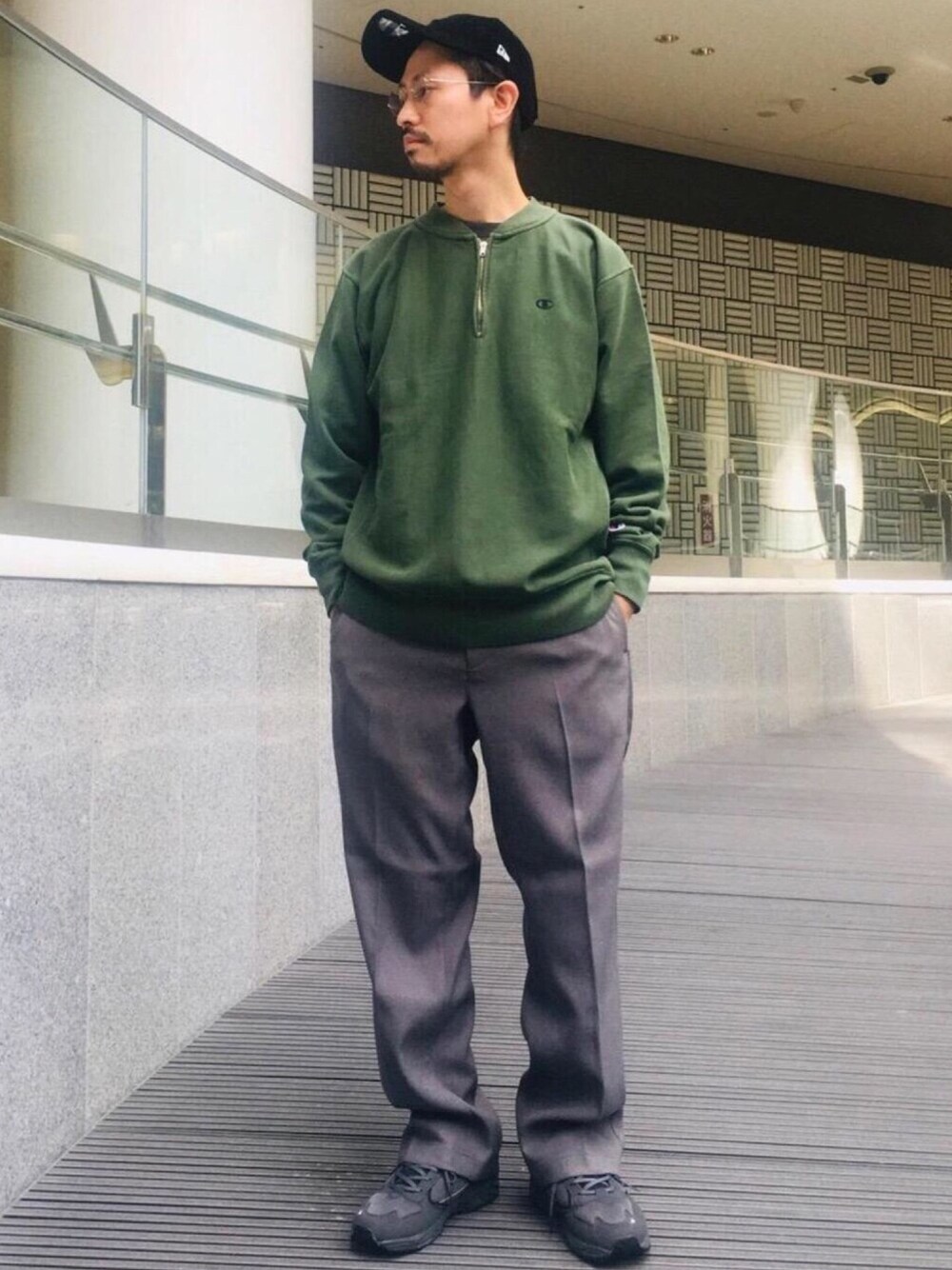 【身長171cm スウェット L Tシャツ L パンツ L スニーカー 26】 ハーフジップスウェットをポイントにモノトーンでまとめました。全体的にスポーティーですが、帽子の素材感などで季節感を出しています。
