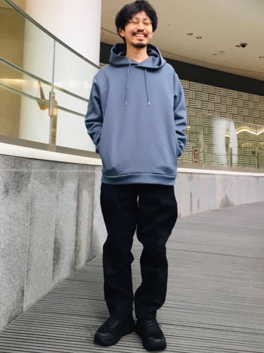 【身長171cm size パーカー L カットソー L パンツ L シューズ 26】 ロイヤルカラーのパーカーにネイビーのパンツを合わせてブルートーンにしました。