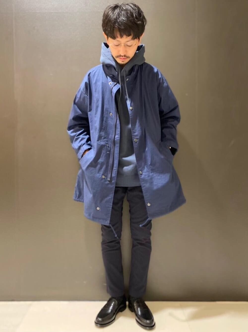 【身長171cm size アウター L パーカー L カットソー L パンツ S シューズ 40】 ネイビーのフィールドコートをメインにネイビートーンでスタイリングしました。シューズはローファーで少しキレイめにしました。