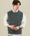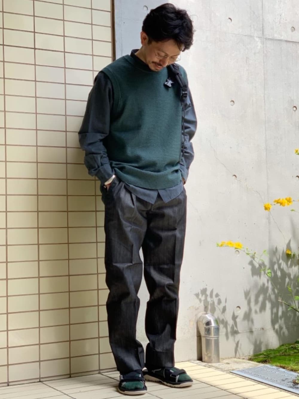 【身長171cm size ベスト L シャツ L パンツ L サンダル 8】 ベストとバンドカラーのシャツ、ソックスをグリーンカラーで統一し、モノトーンのパンツとサンダル、バッグでスタイリングを引き締めました。