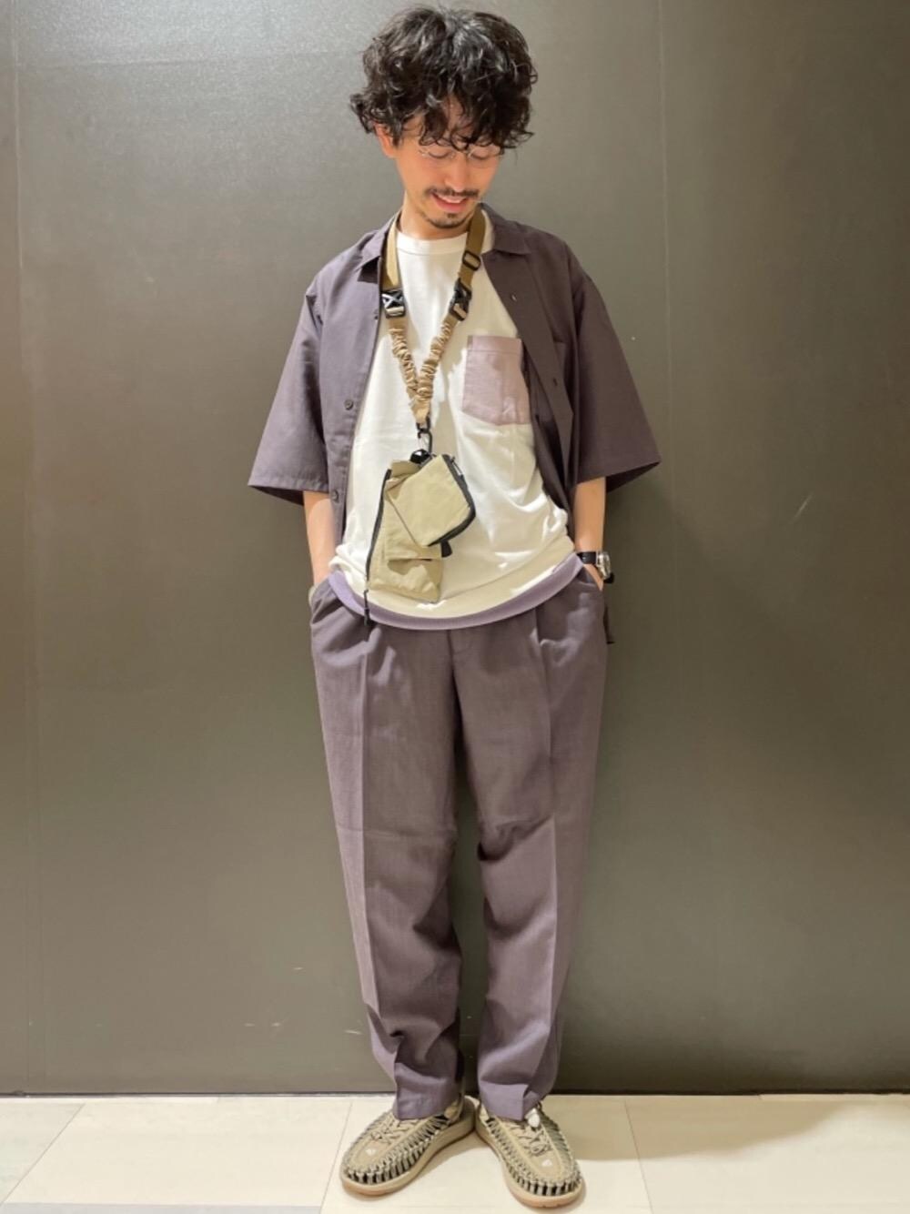 【身長 171cm size シャツ L カットソー L パンツ L タンクトップ L サンダル 8】 パープルシャツセットアップのインナーにポケットがライラックカラーのカットソーとタンクトップを合わせました。小物をベージュカラーでまとめて統一感を出しています。
