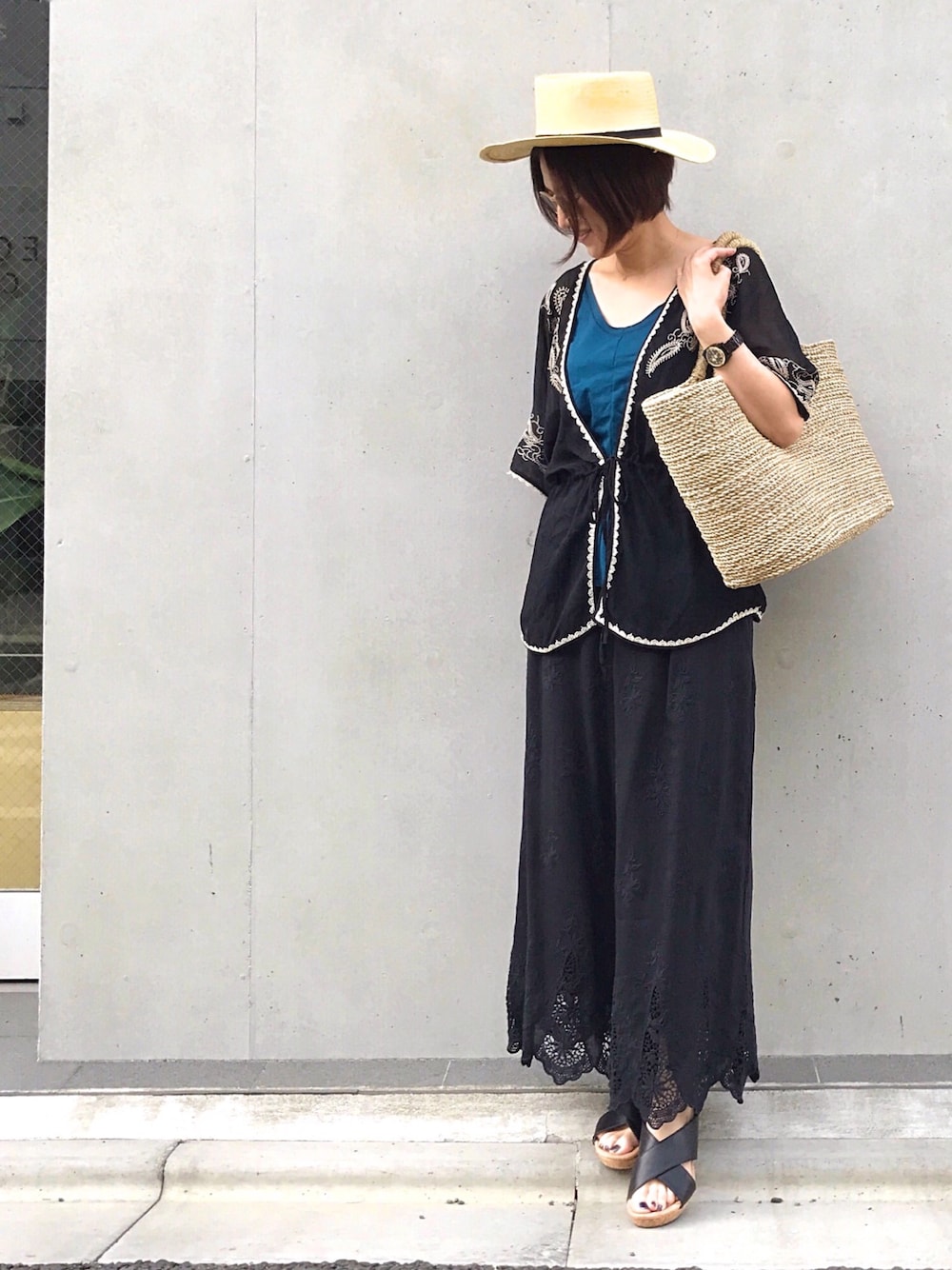 刺繍レースのトップスとパンツに 帽子とかごトートでちょっと早いけど 夏っぽいコーデをしてみました🌈 このAMERICAN RAG CIEのパンツは 上質な感じがめちゃくちゃ気に入ってます🖤😊