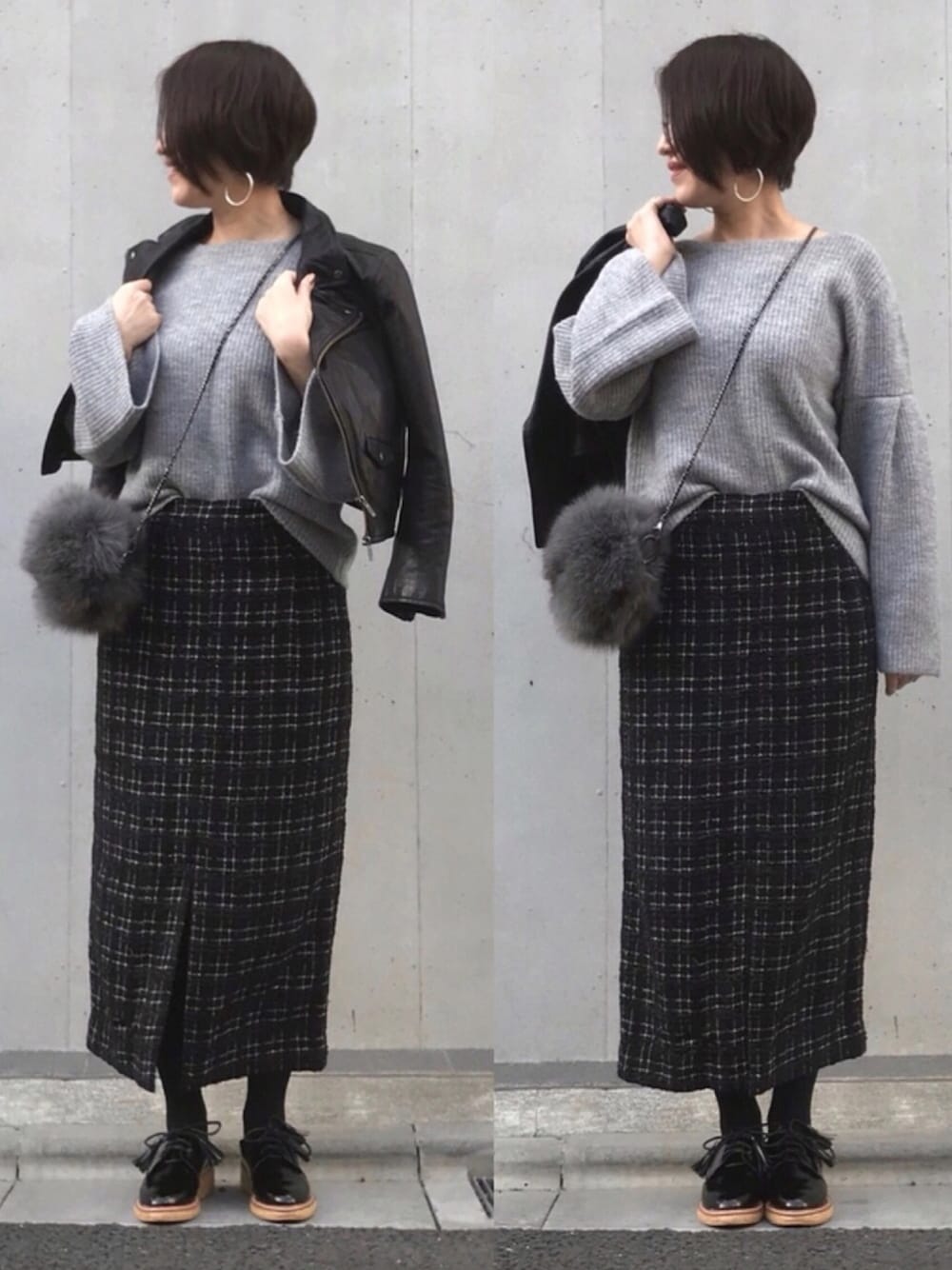 ほぼ全身FURRY RATEコーデ。 モノトーン気味🖤 チェックのロングスカートは きれいめコーデにぴったりです。 スリットが深めに入ってるから ソックスと合わせても可愛いかも! ニットはベルスリーブ🔔