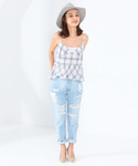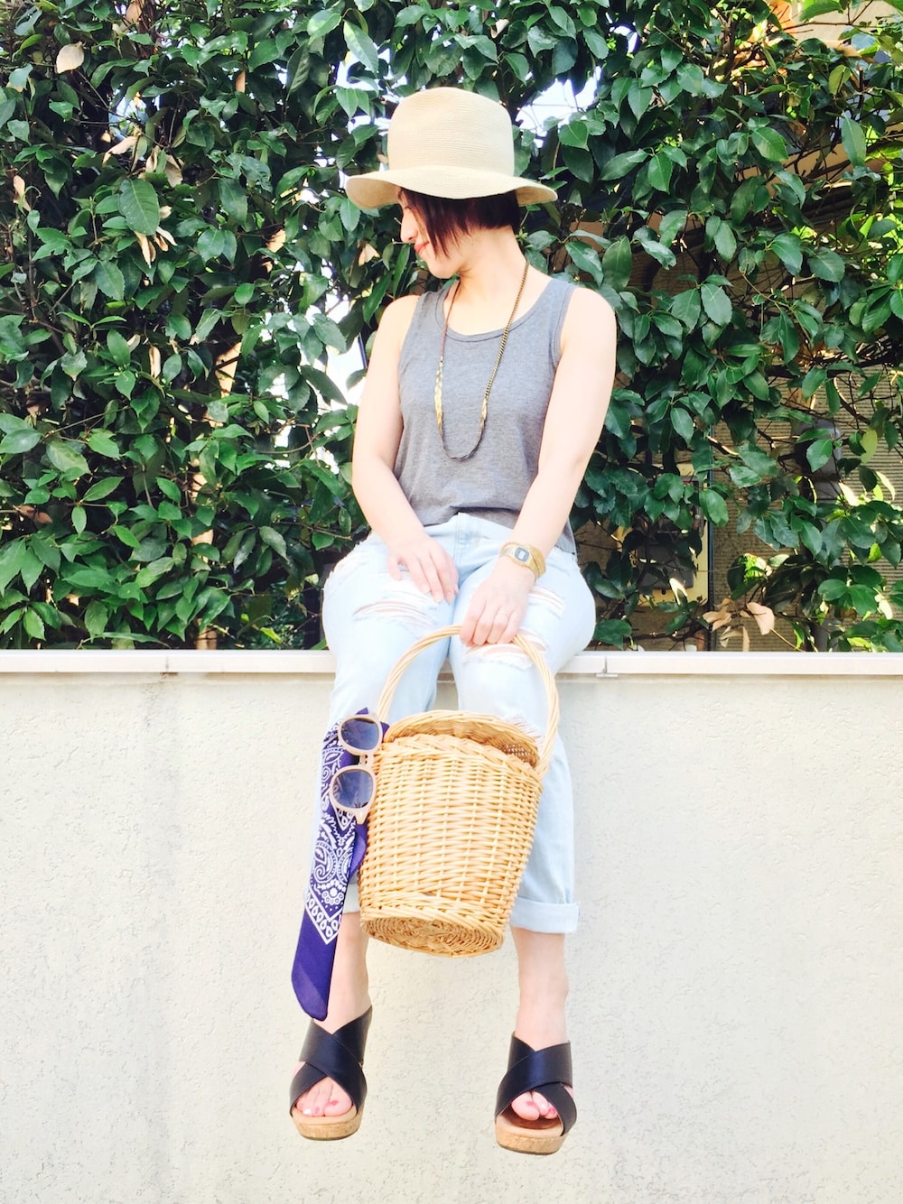 ダメージデニムパンツで足をぶらぶら😀 サンダルとタンクトップで涼しげにしてみました✨ かごバッグで夏度アップ😎