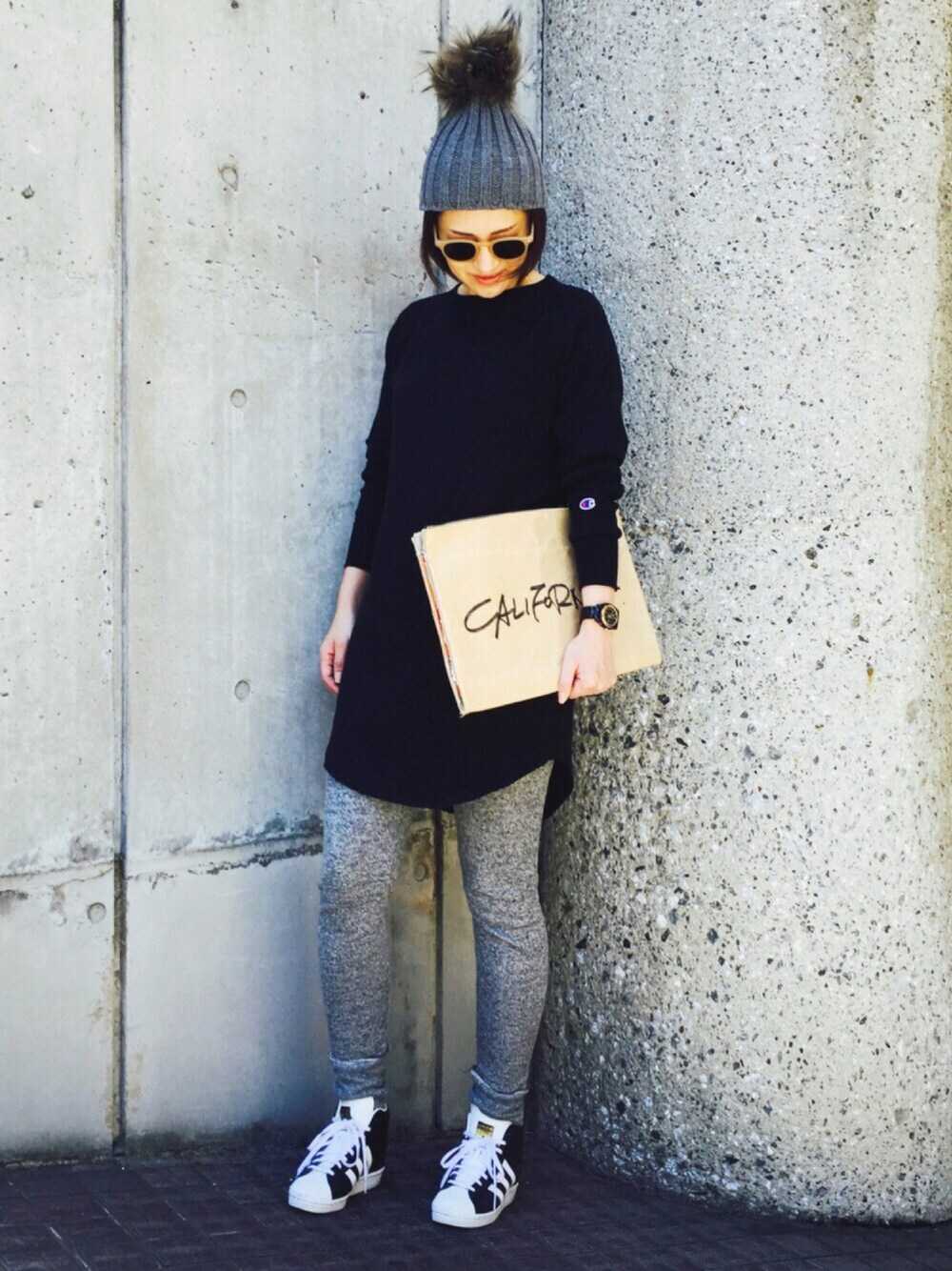 今日は去年から愛用してるポンポン帽を、 チャンピオンのワンピとあわせて モノトーンコーデ📸パシャリ✨ そして秋コーデはまだあついです💦 このチャンピオンのワンピはサンプル品です😆 グレー色の同じワンピのコーデも 近々チャレンジするのだ! スニーカーはプロモデルではなく adidas originalsのアップヒールハイカット🎶 去年から履いてるけどお気に入り🙌