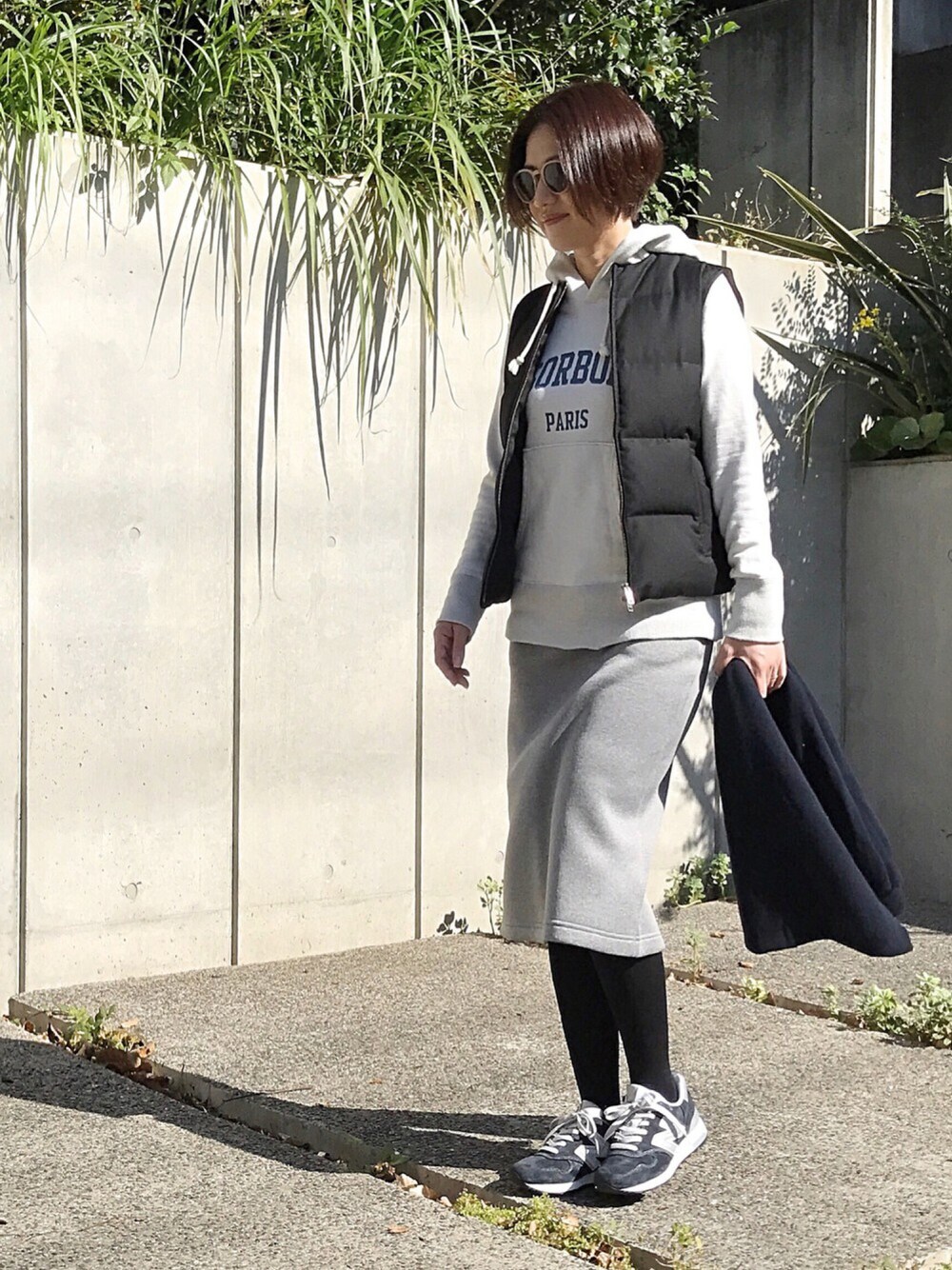 ミラーオブシンゾーンのグレーのパーカーに AMERICAN RAG CIEの黒いダウンベスト✨ HYKE×adidasのスウェットスカートもグレー✨ ストールはGU、そしてニューバランス、 ともにネイビー✨ グレー+黒+ネイビー💙 HYKE×adidasのスカートは 後ろにロゴが小さく付いてるところが好きで 前から大切に履いてます( *`艸´) パーカーにダウンベストって 自分的には鉄板👍