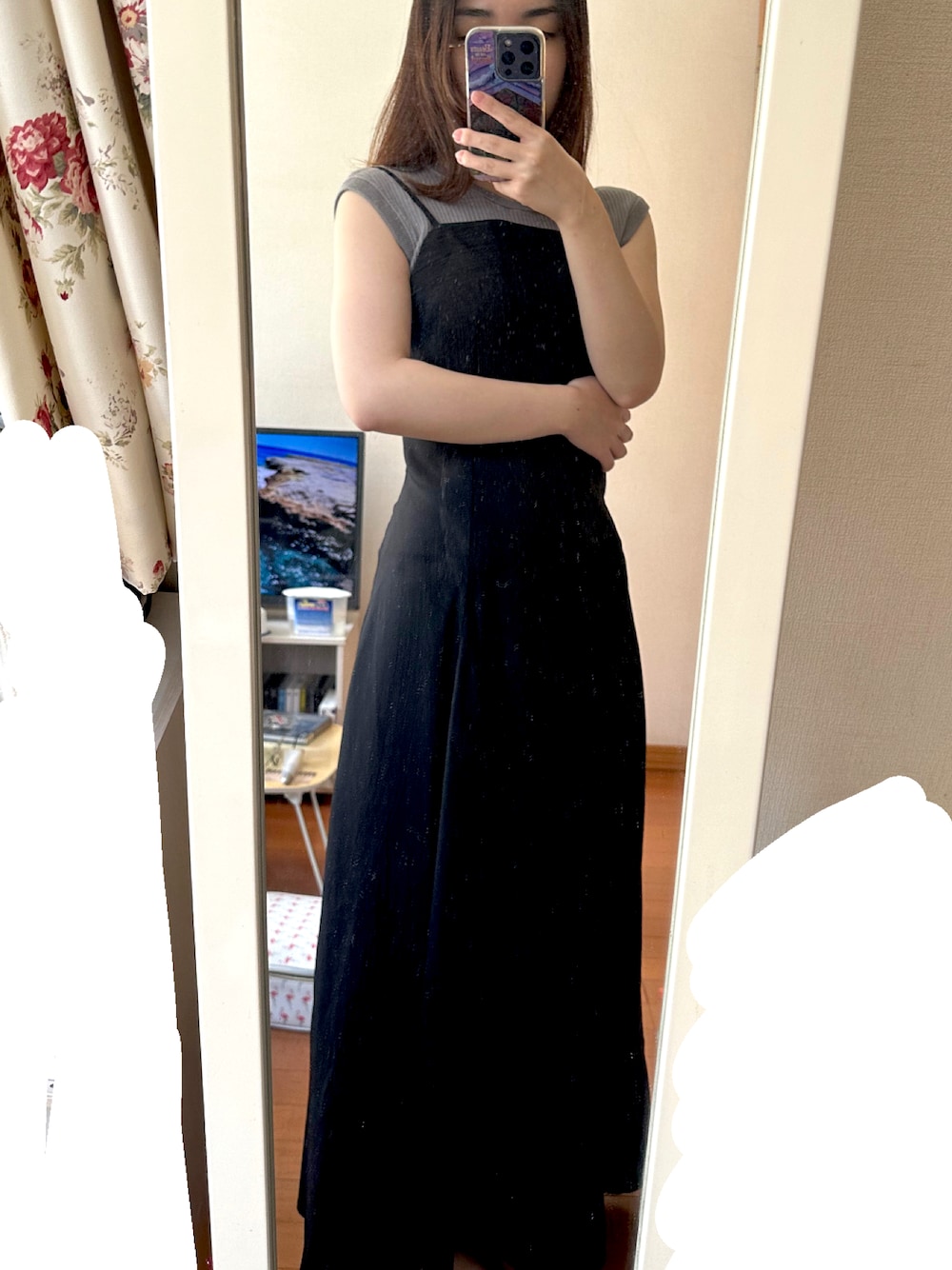 このキャミワンピースお気に入りです。 ウエストが締まってますが後ろがゴムなので苦しくないし、めちゃスタイル良く見えるし、着心地いいです。 丈は私の身長で、地面に擦るほどではないけど長めです。 ギラギラバッグを持った時に毛玉ができちゃいましたがなんとか誤魔化して着てます笑