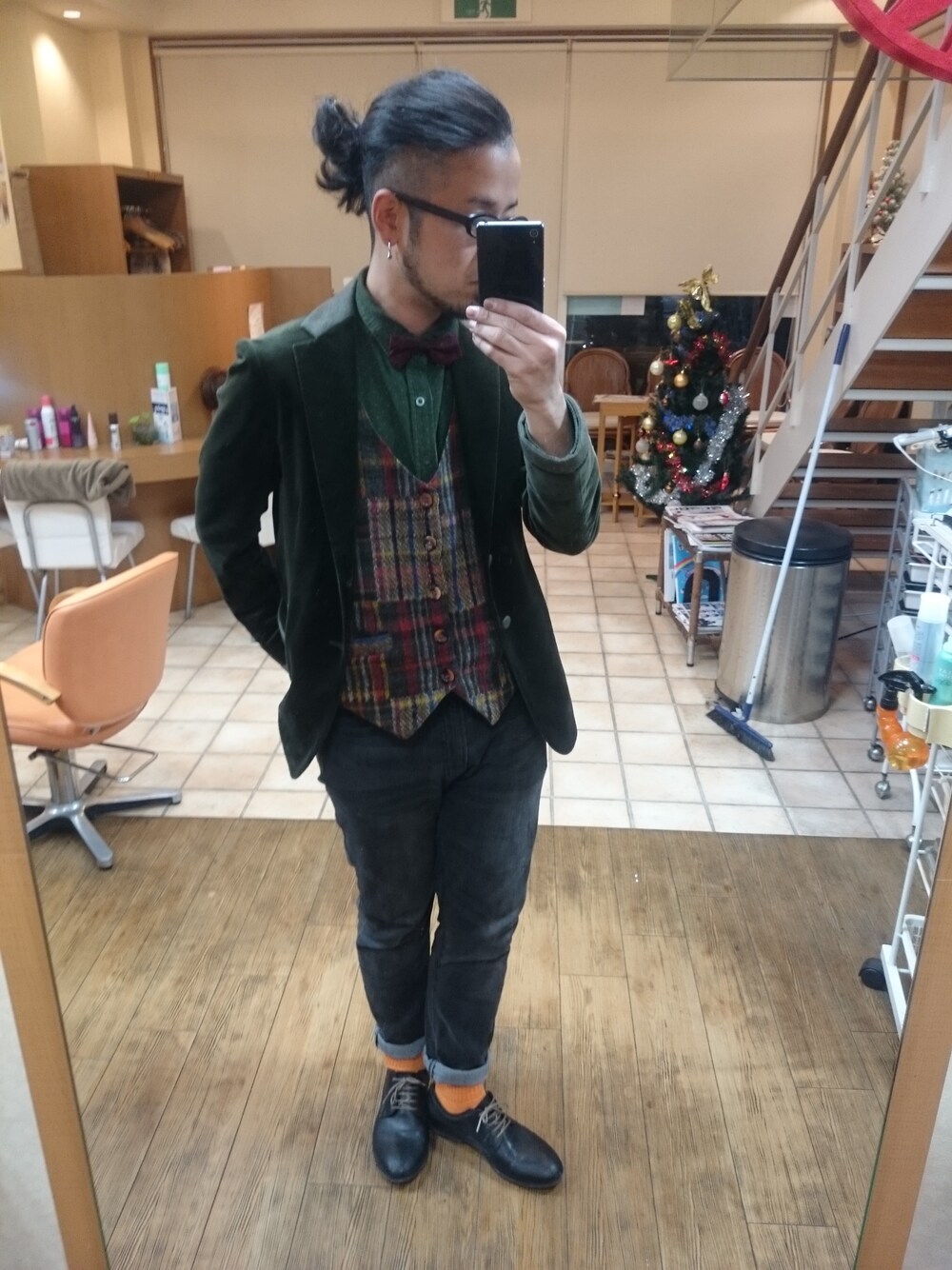 皆さんこんばんは! 今日はクリスマスコーデ第三弾です❗(笑) と言ってもいつもと代わり映えしないコーデですいません😅 携帯の絵文字を見ていると黄色っぽいオレンジもクリスマスカラーに使えるなと思い靴下をそのようにしてみました🔔 しかしながら、なんとなくバランスが悪い気はしますが(笑) 皆さんクリスマスは楽しく過ごせましたか? 僕は家族でホームパーティでした❗ 家族団らんって良いもんですね😌