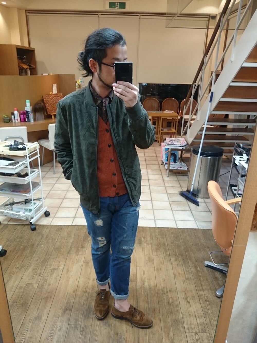 皆さんこんばんは! お久しぶりでございます🙇 今日のコーデは誕生日に嫁さんに買ってもらったフェイクスエードジャケットを使用したコーデになります。 ボタニカル柄が全体に入ったカーキ色になります。 地味にシャツをペイズリー、ネクタイをペイズリー、アウターはボタニカル、謎の合わせ方をしてみました(笑) まだ寒いので冬物のカーディガンを使用してます😂 足元は少し頑張って肌を出してみました💪 今日はこんな感じで🙇