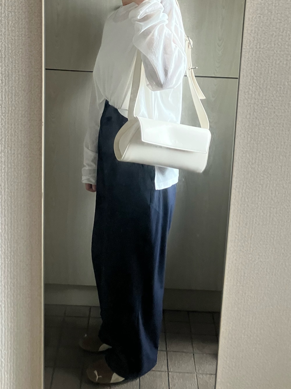 白のロンTにネイビーのワイドパンツを合わせた、 シンプルで清潔感のある大人カジュアル。 ゆるっとしたシルエットで楽ちんなのに、 ホワイト×ネイビーで上品にまとまります🤍 バッグも白で統一して、抜け感をプラス。 おでかけにもワンマイルにもぴったりなコーデです✨