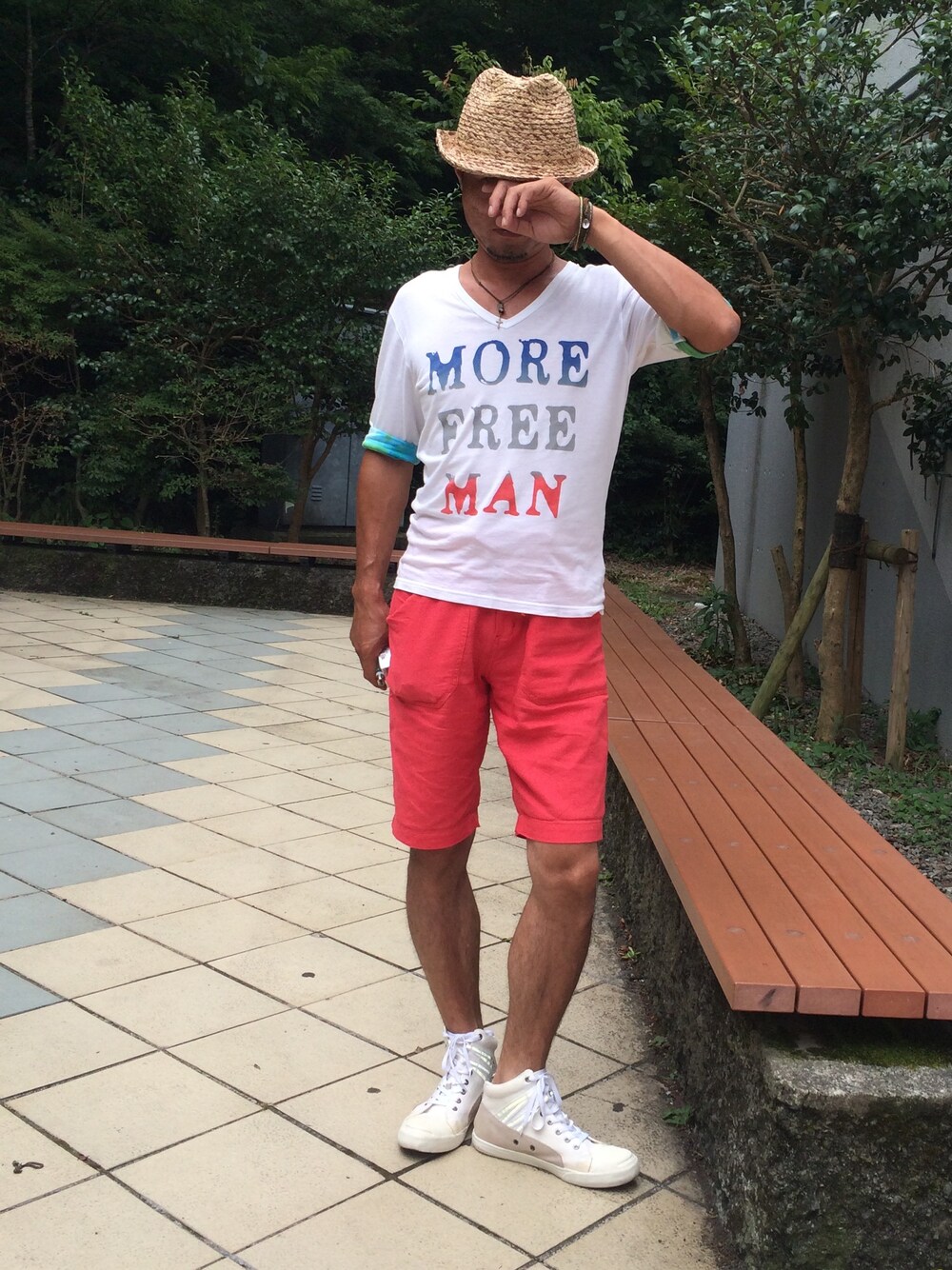 ホワイト系のスニーカーを着用したメンズの夏コーディネートの1枚目の写真