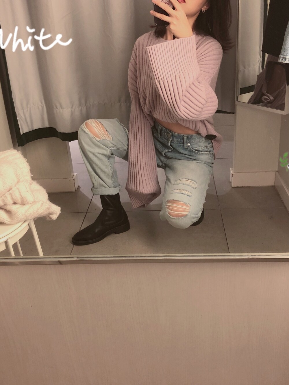上衣是喇叭袖,露背,后背有俩绑带设计的浅粉紫色毛衣,我把衣服前摆塞到了内衣里面