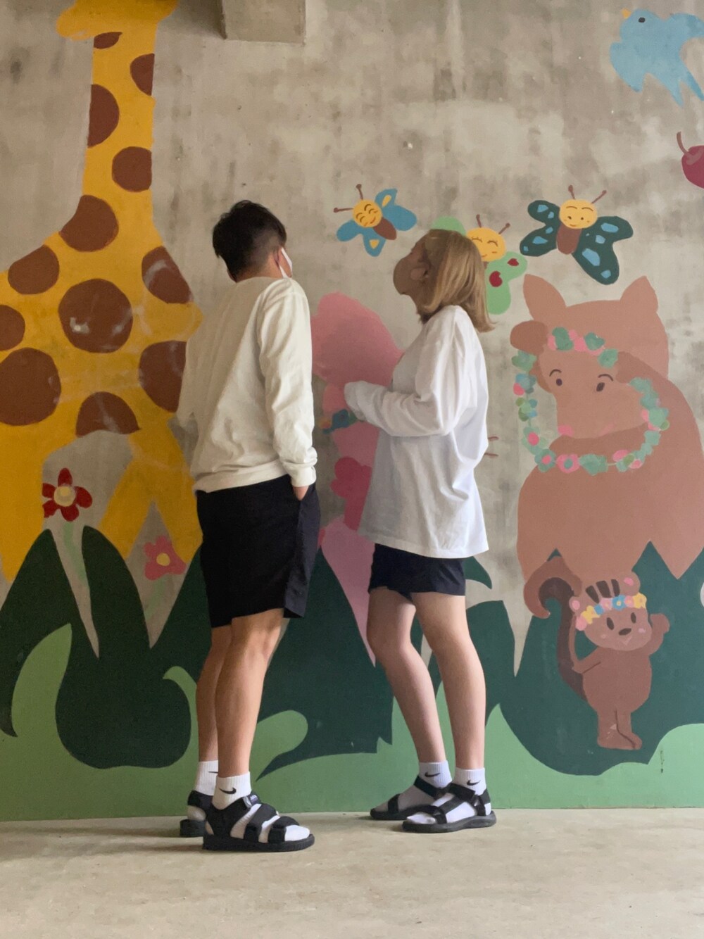 地元のカフェに行きました☕🗻☔ 雨が降っていたのでショートパンツにサンダルで、黒と白のシンプルなコーデに😳☝🏻 とにかく壁の絵が可愛かったです🤍🤍 メンズのショートパンツだけどXSなら全然履けたのでよかったです◎