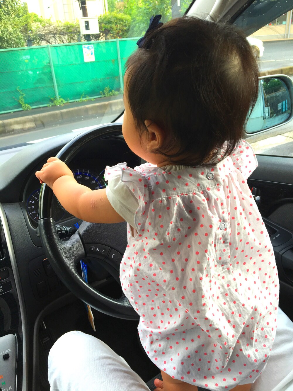 無免許で運転デビュー(´・_・`) きちんとエンジンは切れてます☺︎ クラクションの部分をばんばん叩いても力が足りないので鳴らない…。笑 今日はハイハイたくさんさせたかったのでお気に入りのはらぺこあおむしのサロペットでした♡