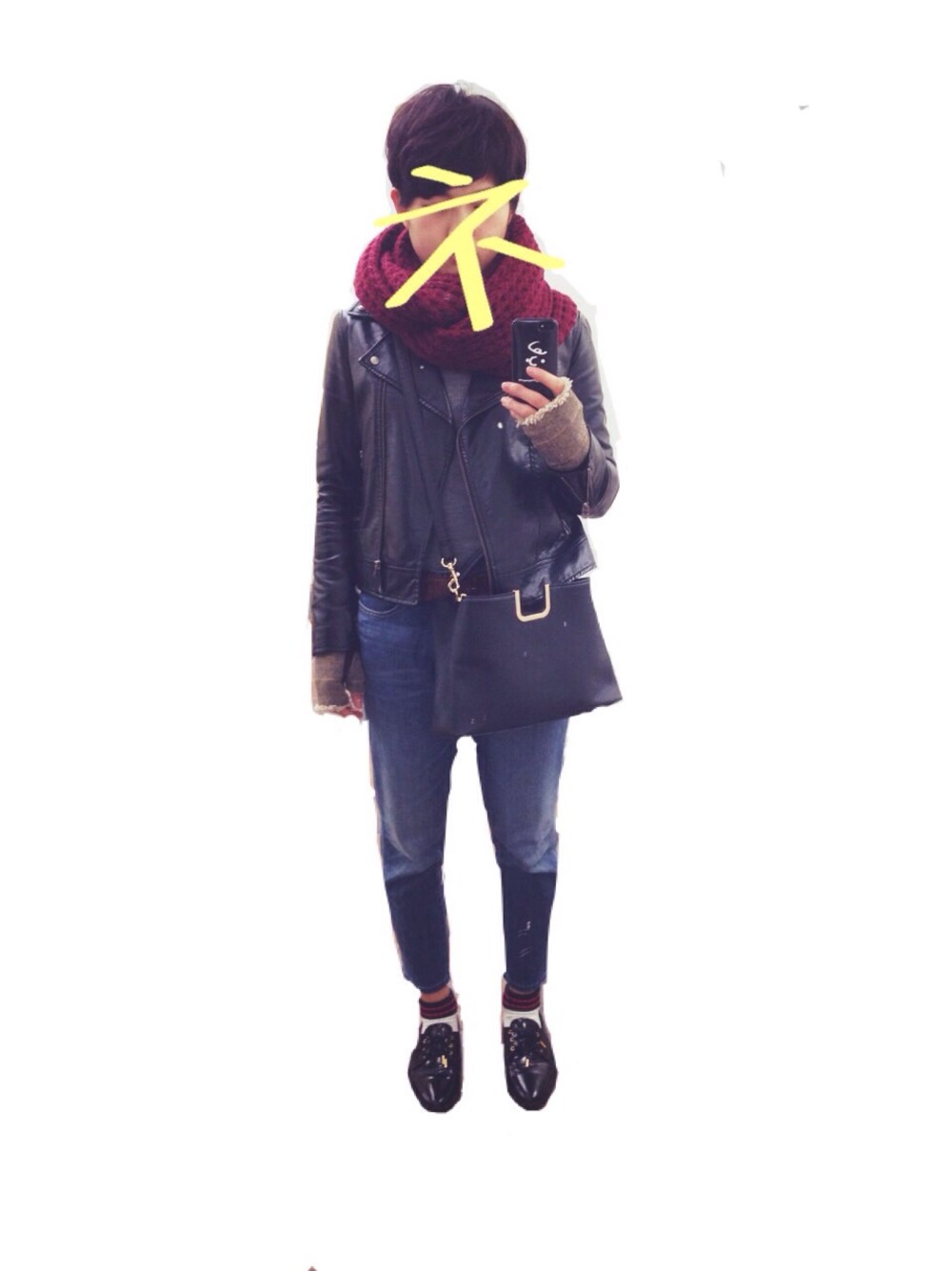 ライダース、デニム:UNIQLO ハイネックニット:無印良品