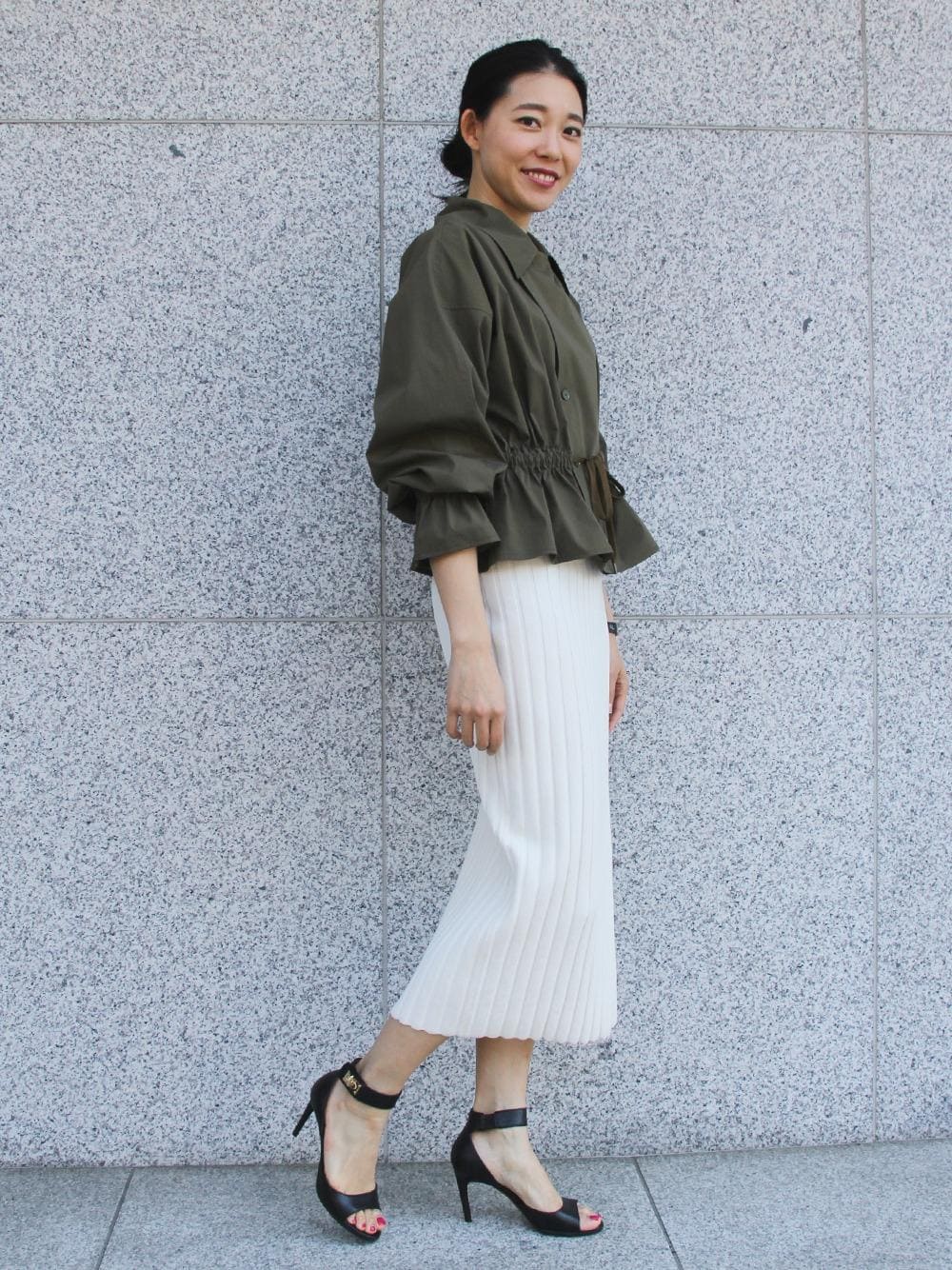 トレンチコートをイメージしたブラウスを主役にシンプルなタイトスカートをあわせました。ブラウスは袖のギャザーやウエストを絞ることで女性らしいシルエットですが、甘くなり過ぎないようにフロントボタンを上まで留めて見た目を引き締めました。足元はヒールのサンダルで上品さをプラスすると洗練された印象に仕上がります。