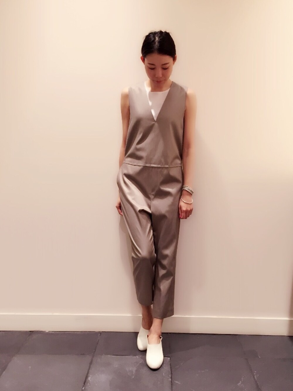 光沢のある生地のオールイン。大人の女性が着るオールインワンとして、オンオフどちらでも着られるのが嬉しい一枚。中に着たハイゲージのニットも、コーディネートしやすくワードローブのマストアイテムです。