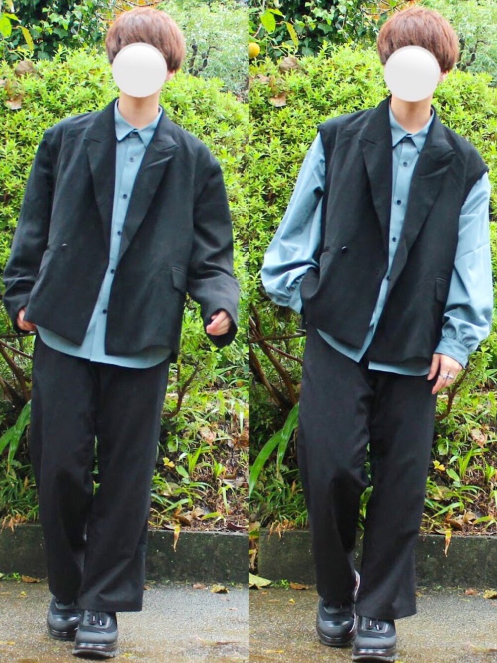 ご覧いただきありがとうございますm(__)m KUUUPYの2wayダブルテーラードジャケットの2つの着こなし方です! みなさんはどちらが好きですか?🤔
