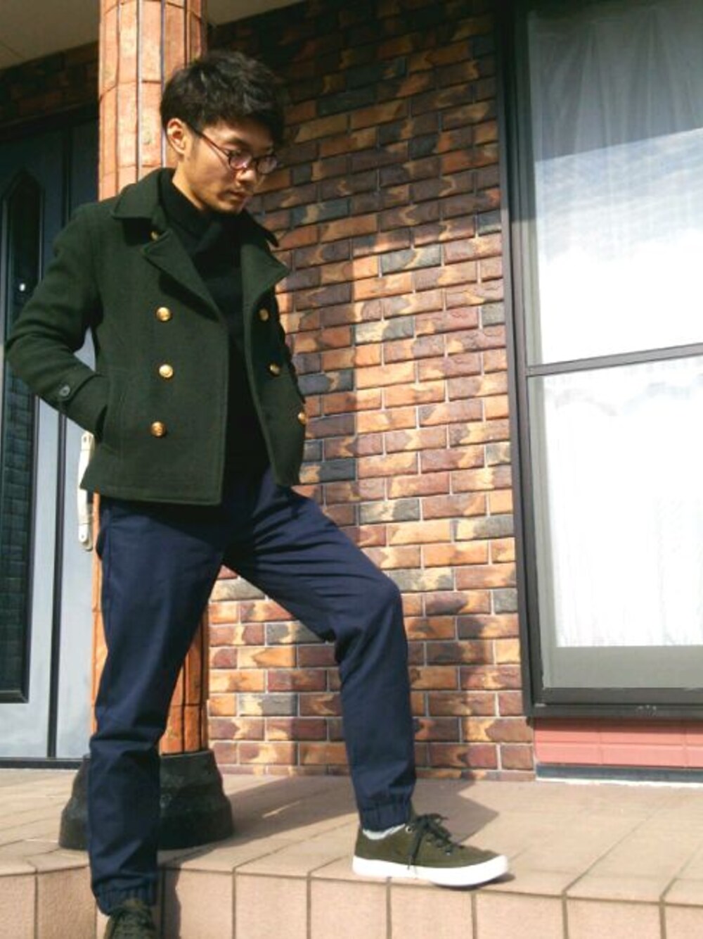 カーキのPコートにカーキのスニーカー、丸眼鏡。 初投稿。