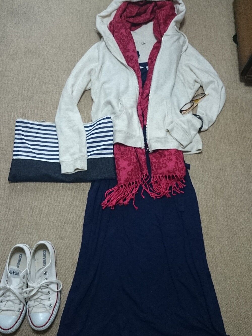 スニーカー×マキシワンピースも好きです。 差し赤はでストールつかいました、