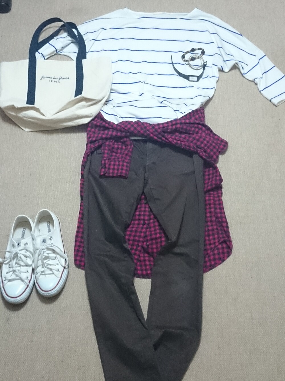 青ボーダー×赤チェック の組み合わせです。 ボーダー uurban RESEARCH チェック UNIQLO 靴 コンバース