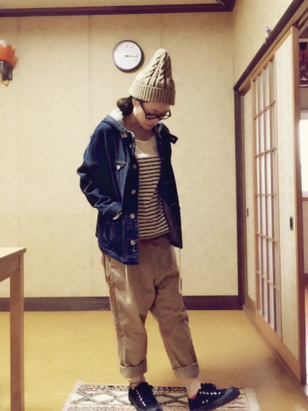 ブルー系のデニムジャケットを着用したレディースの秋コーディネートの1枚目の写真
